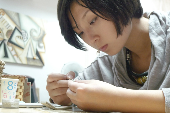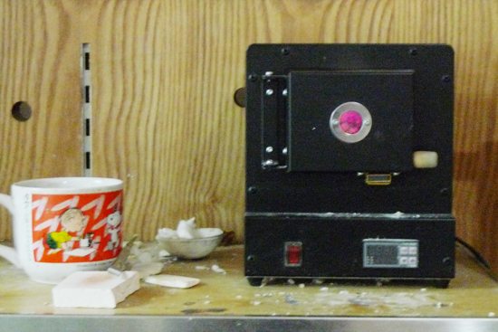 打磨好之后就放进这个迷你烤箱里烧。以前在学校的时候上过陶艺课,不过这么小的窑我是第一次见。起初我还在四处张望,寻找烤箱,原以为烤箱在某个房间里,哪知道竟然就是我身后这个小黑盒子。不过你别小看它,看玻璃后面火红的颜色你就知道它的威力了。