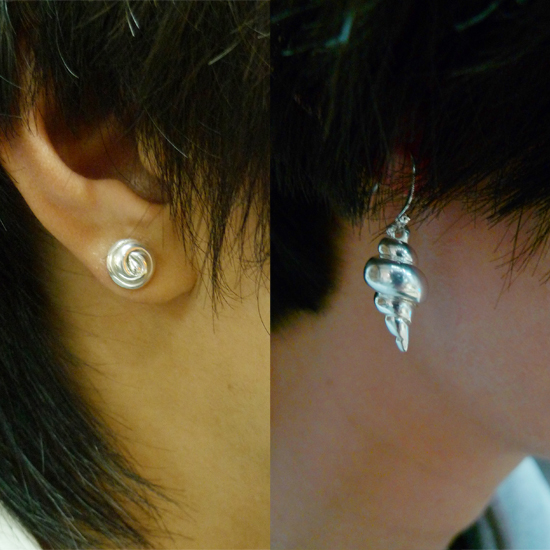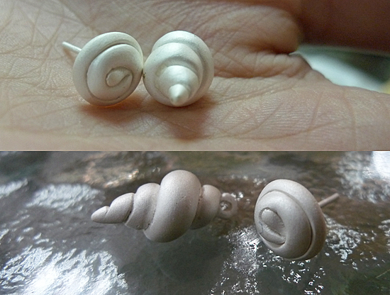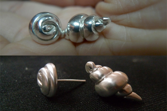 这就是我们的设计草图,以“海螺”为主题,一只吊坠耳环,一只耳钉。至于为什么是海螺,恩,没什么详细的考究,就是对这个题材和造型情有独钟吧。我喜欢大海。