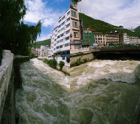 这就是汹涌的折多河,沿着折多河,就是康定的核心区。有多汹涌?看看河岸的房子,看看比例关系就明白了。