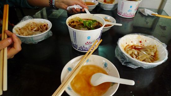 以前我没听说过冒菜,这是第一次听说也是第一次吃,其实就和在广东吃到的麻辣烫类似,就是把各种粉啊菜啊瓜啊豆芽等等一锅烫,放上自家的调味品就可以吃了。我吃了一碗冰粉,和07年在贵州凯里吃的味道差不多,也是甜甜的冰冰凉的感觉。粥仔和爬仔吃的粉,口感介于广东河粉和果冻之间,爽滑脆嫩,嗖一滑就进肚子了。