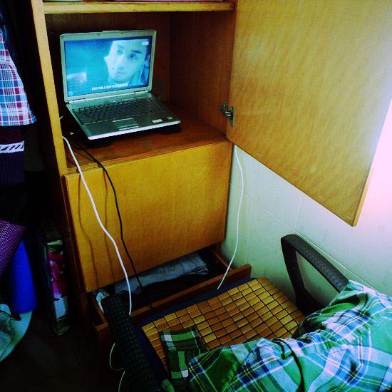 嘿,你看下面,我把放裤子的抽屉抽了出来,刚好架脚。