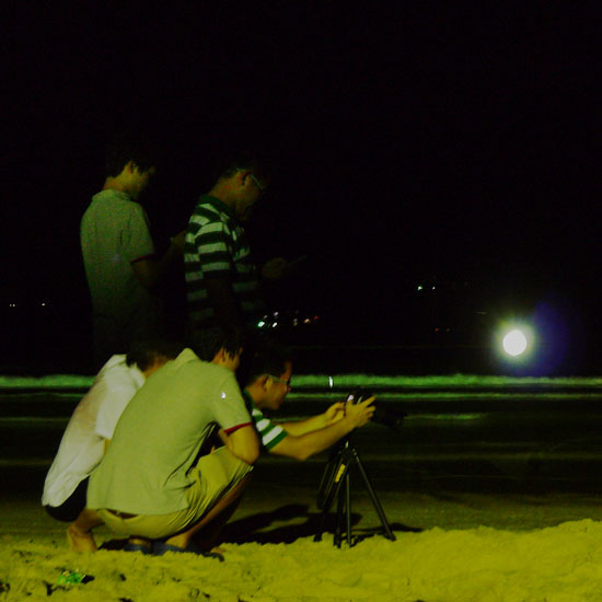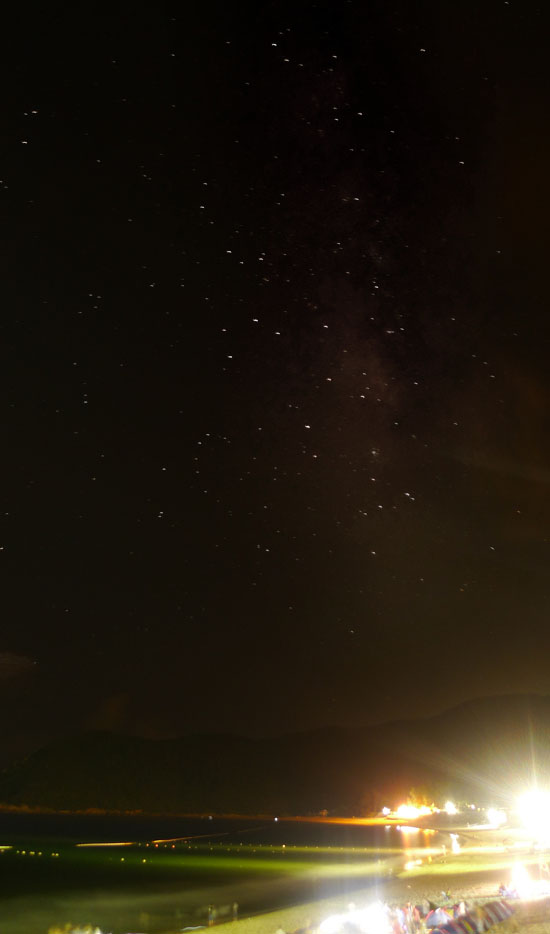 回到营地吃饱了烧烤后,六个男人沿着五公里的海滩散步,来回走了两个小时,加上下午在海里拼命地翻滚,才十一点就全都倒下了,本来说要玩杀人游戏的家伙们一个个全都“自杀”了,只剩下我和小邱俩人在围栏边上将镜头对准天空。