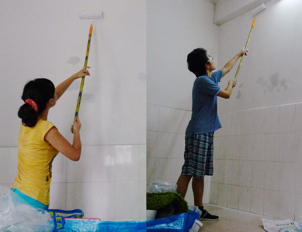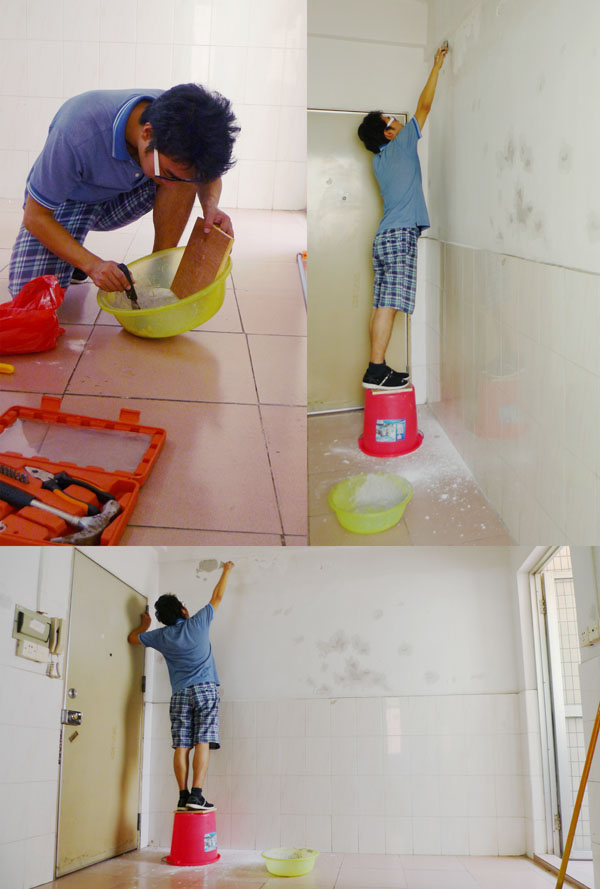 这个一室一厅的小房子是个彻底的空房,还留有许多前一个租户的各种生活痕迹,例如各种钉孔、各种坑坑洼洼和各种贴或钉的很丑挂钩和胶痕。显然这是每个城中村出租屋的共同特征,大家都是短住,房子也只是乱七八糟的随便过过,要多不讲究有多不讲究。我和叶子都是设计师,不说什么生活追求这些没人愿意听的话,这样破破烂烂的墙面实在是对我们俩审美的极大冲击。于是,我们自己花了35块钱买了腻子粉、乳胶漆、滚筒和铲子,把房子重头到尾修补和粉刷了一遍。