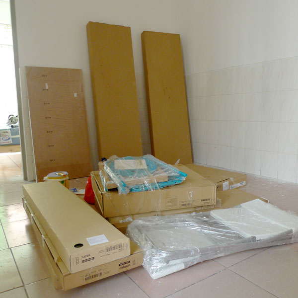 签了租房合同的第二天(9-5),我们就把房子测量了一遍,画了平面图,然后规划和设计新房子要怎么布置。9月6号我们去宜家逛了一天,仔仔细细地把几乎所有家具都看了一遍,根据尺寸、款式(风格)、材质、价位几个因素把适合我们新房子的家具筛选出来,记录在小本子上,回来后根据平面图再筛选一遍,才再确定了一批价位最低、最实用又风格统一的家具。第二天(9-7)就直接去宜家根据货号把东西全部买回来,前一天没确定的一些小件物品也一并补充到购物清单里。由于买的东西都比较大和重,尽管宜家是平板包装,但是我们两个人实在没法搬回来,只好让宜家送货,但是轮单要排到后天才能到家,于是我们就趁着这个时间差,在9月8号把墙上的坑洞全都补上还刷了墙,9号找楼下的电工师傅加装了一些插座和电路,这样就把时间全都用满了。