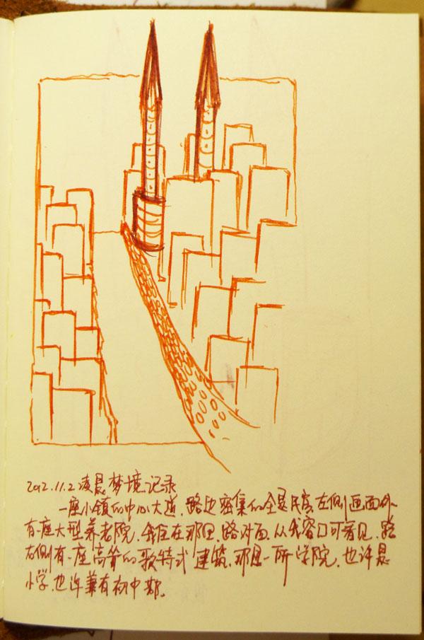 这是今天清晨我的梦境,醒来后我觉得应该把它记录下来,于是在吃早餐时我把这些镜头画了下来。