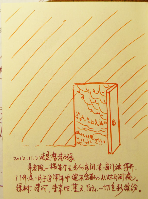 #4)养老院一楼某个无光的房间,有一扇门被打开,门外是一片于这闹市中绝不会有的丛林与河流。绿树、清河、青草地、蓝天、白云,一切色彩缤纷。
