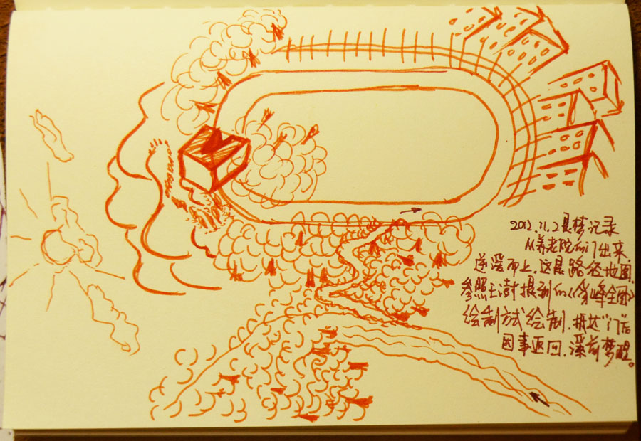 最后一张地图是我凭着对梦境的记忆,按照我对王澍《设计的开始》书中第137页所提到的《豸峰全图》的绘制原理的理解,自己的一次简单的尝试,对于以个人行动范围来圈定的地形而言,我感觉这种制图方式要比现有的地图制图法在不失描述完整性的同时多了一种感性,但我不清楚更大范围的地形要如何绘制,纯当作一次实验。