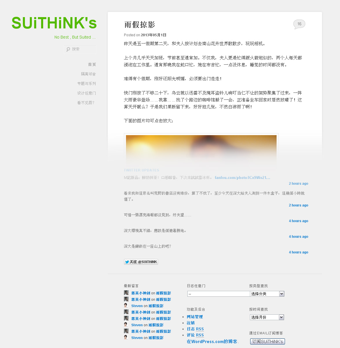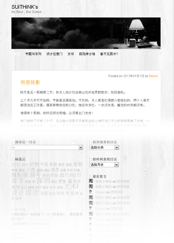 快三年了,我才换这一个。 既要简洁又要满足功能,还得合心意,换个模板还真不容易,现在这个还是调整了两三天才觉得ok的呢。以前用的博客我都是自己制作模板的,现在似乎不论哪家博客都需要缴费才允许自制模板。也许以后会做个独立博客,虽然费心些,但也自由多了。
