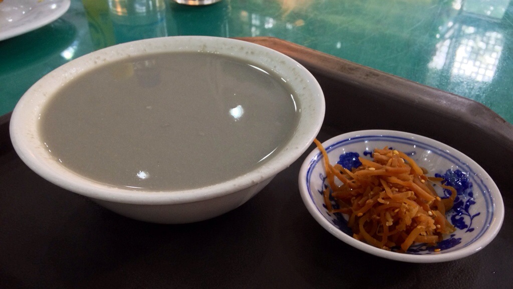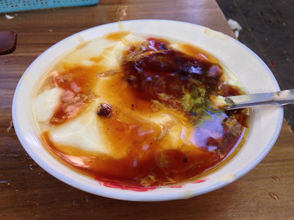 豆腐脑是早餐时在楼下的社区早餐铺里头吃到的,最大的惊喜是南北方网民最有趣的争议之一——甜or咸?我真的从没吃过咸的豆腐脑!在我们家,这玩意儿叫豆腐花,吃前撒白糖,在这撒的是咸咸的韭菜花儿…还是挺好吃的啊!