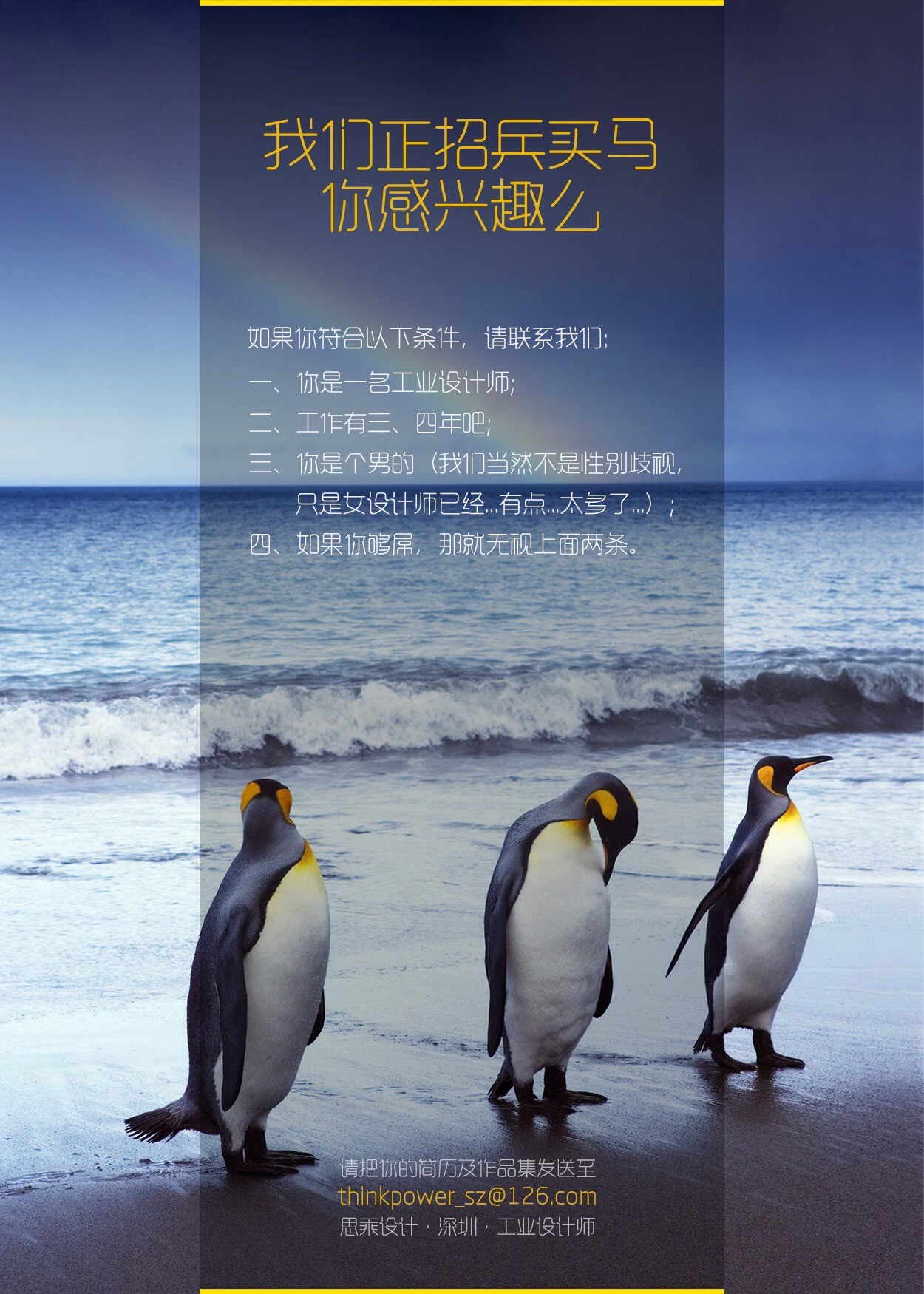 感兴趣的朋友,请按照 ”资深工业设计师+姓名+工作年限“ 的格式命名邮件标题,随邮件附上尽可能不大于5M的作品集,发送到:thinkpower_sz@126.com,简历及作品集的压缩包名称也请按照 ”资深工业设计师+姓名+工作年限“ 的格式命名以便查找。