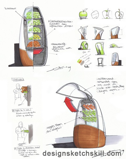 因为要和非设计人员进行沟通,那么图面表达上至少要完整、清晰,可以看到较为准确的形态、比例、基本的材质特点,以及他们最关心的“创意点”。例如这样的草图: