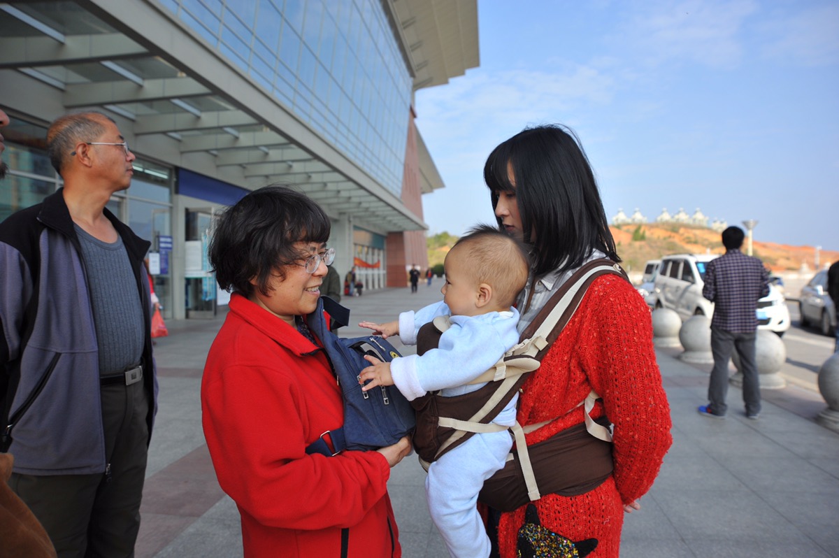 爸爸妈妈和大姑姑一起上火车,爷爷奶奶大姑婆和大姑爷一起来送车。