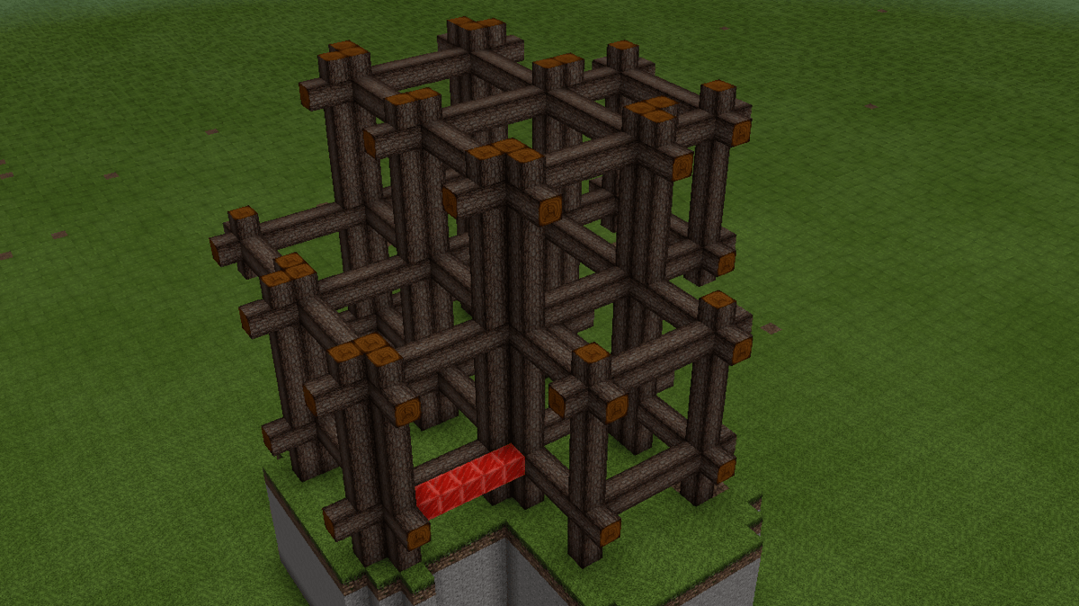 L型凹陷的位置作为建筑的入口,先以红色方块标记。向上搭建第二层的框架,叠加一个反向的L型结构。但二层延伸出去的部分要略小一点,为3*5的空间,同时第一层也延伸出一个5*5的空间,加固底部结构。并在一角延伸一个5*5的空间,作为阳台。
