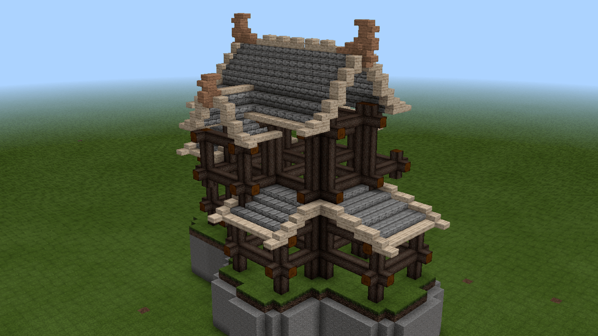 接下来,先把屋顶填上。这时候可以看到最上面的大小两个屋顶的层次关系不太舒服,所以在下一步中,我把小屋顶的位置改低了。