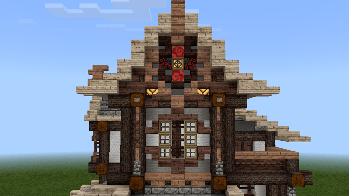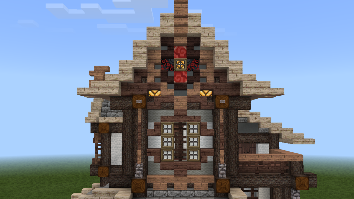 在做山花的时候要注意,为了保证夜间照明的效果,最好使用萤石或红石灯作为山花纹理的一部分。但是,最好不要直接裸露出来。