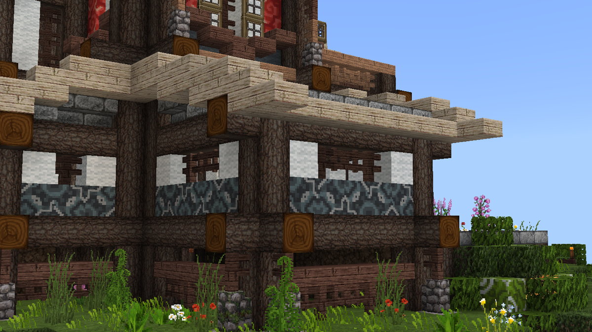 可以看到,一楼墙裙部分的灰色羊毛改成了灰色带釉陶瓦,而二楼窗户的内层则增加了由红色带釉陶瓦组成的竖条装饰。