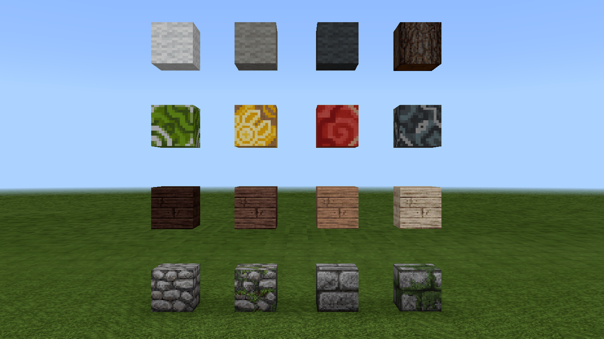 从左上角开始,分别是:白色羊毛、淡灰色羊毛、灰色羊毛、云杉木、绿色带釉陶瓦、黄色带釉陶瓦、红色带釉陶瓦、灰色带釉陶瓦、深色橡木木板、云杉树木板、丛林树木板、桦木板、圆石、苔石、石砖、苔石砖。
