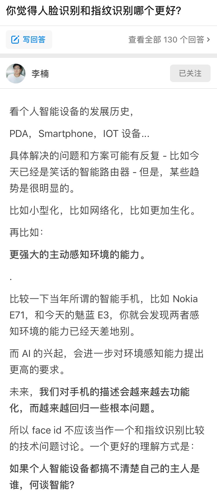 今天在你觉得人脸识别和指纹识别哪个更好这个问题下看到一条回答: