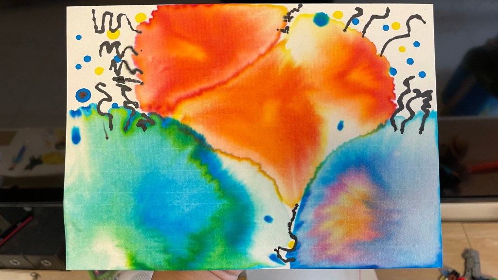 虽然是有网络课程照着一步一步地做,但是小柒没有完全按照老师教的颜色配比、位置布局和用水分量,而是自己凭着感觉去做了这样一幅画。相比之下,和老师那个范本里的一个一个单独的、很规整的水母群相比,我更喜欢小柒这样一个色彩缤纷、挤在一起的状态,充满了色彩的张力,太好看了!