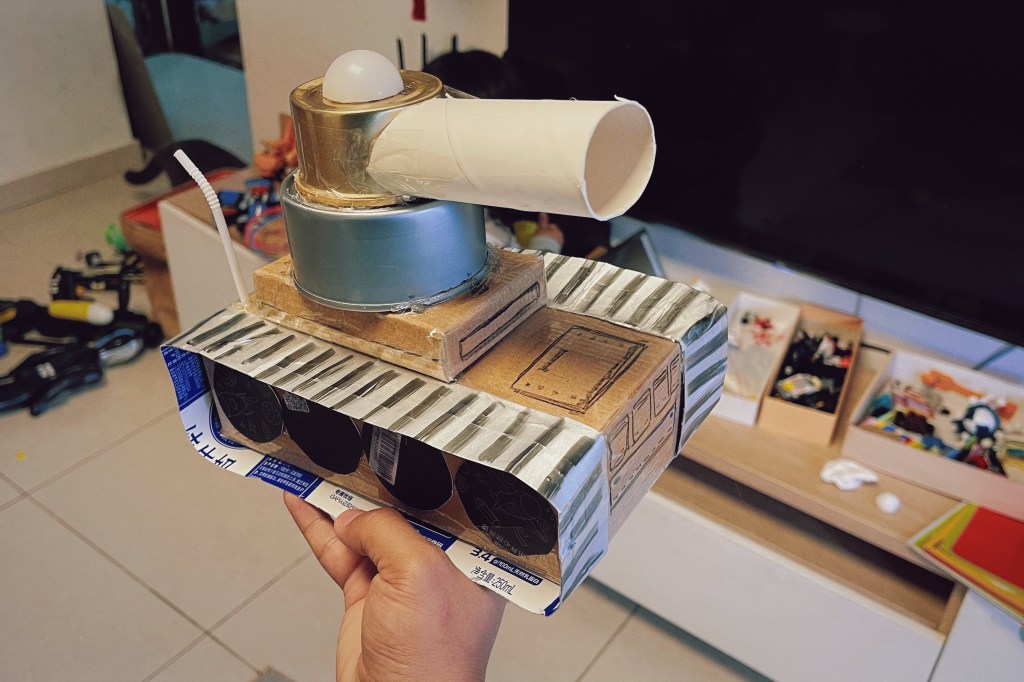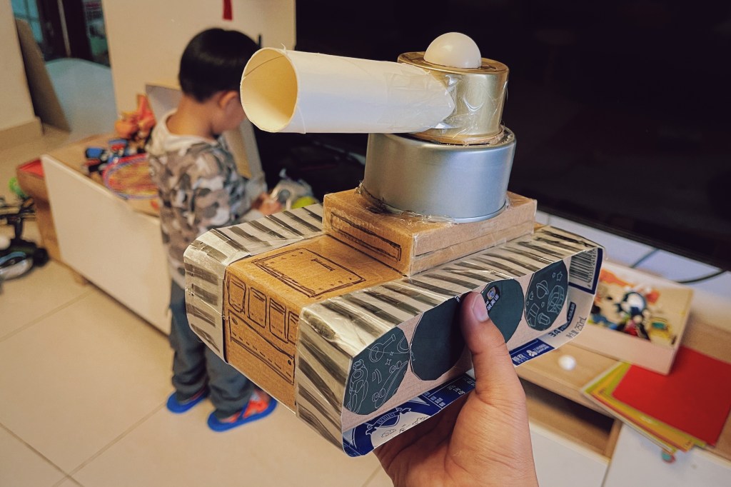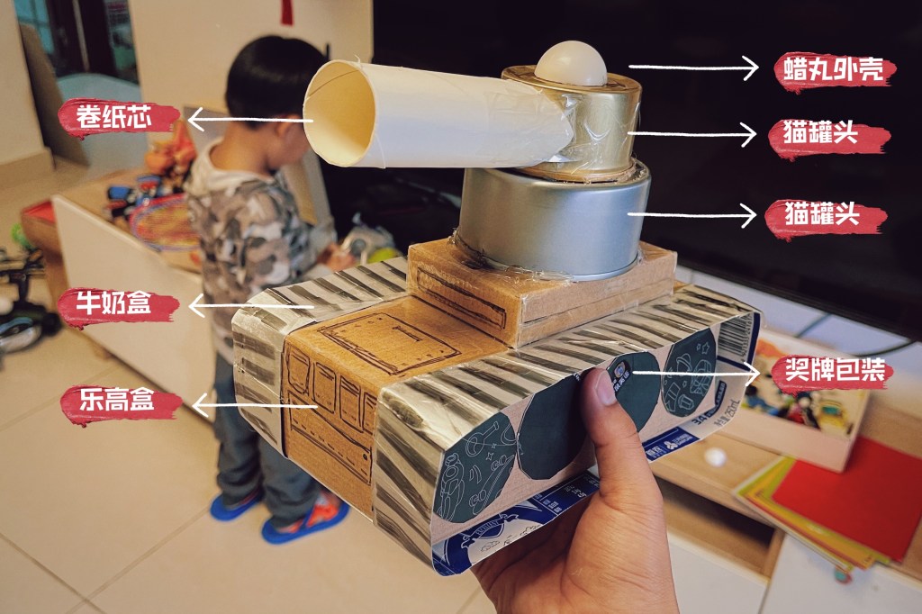 这周末亲子作业的主题是,用家里的废旧材料制作飞机、汽车或轮船之一。我负责收集材料和构思,小柒负责按压、固定和传递工具。期间,小柒问了个好问题: