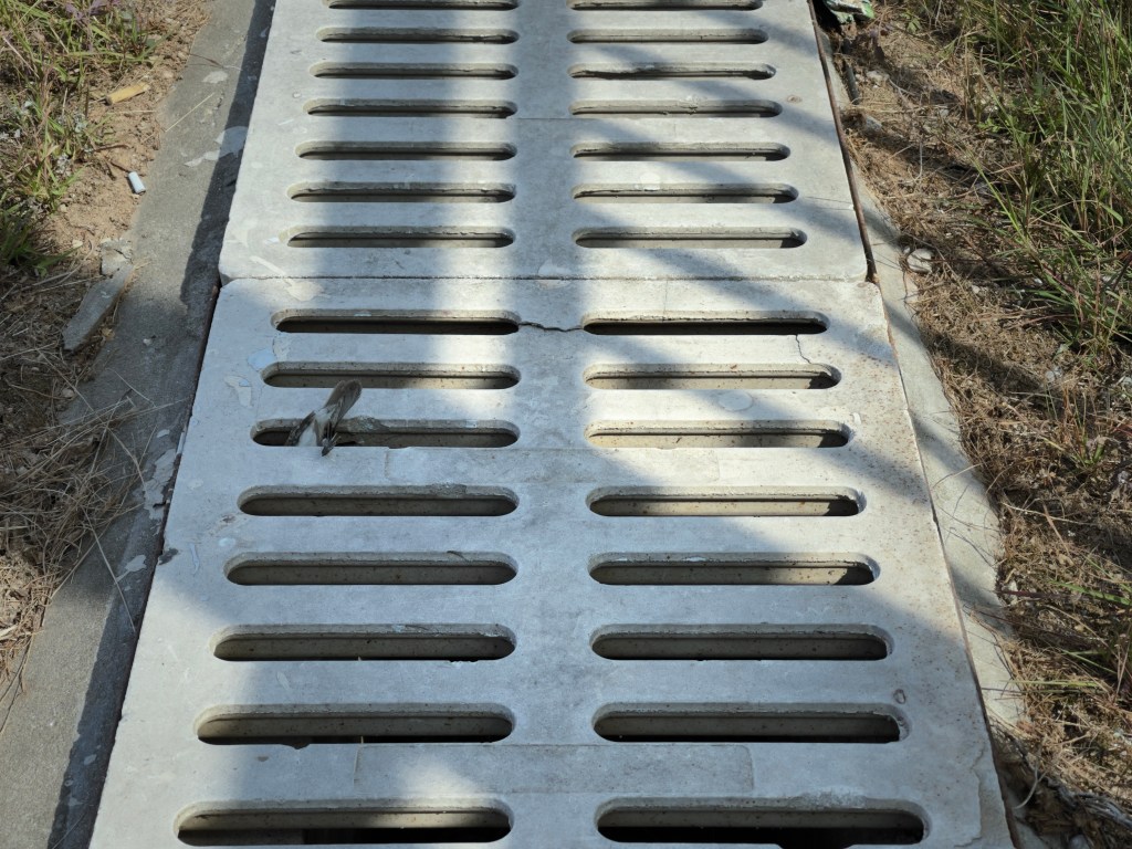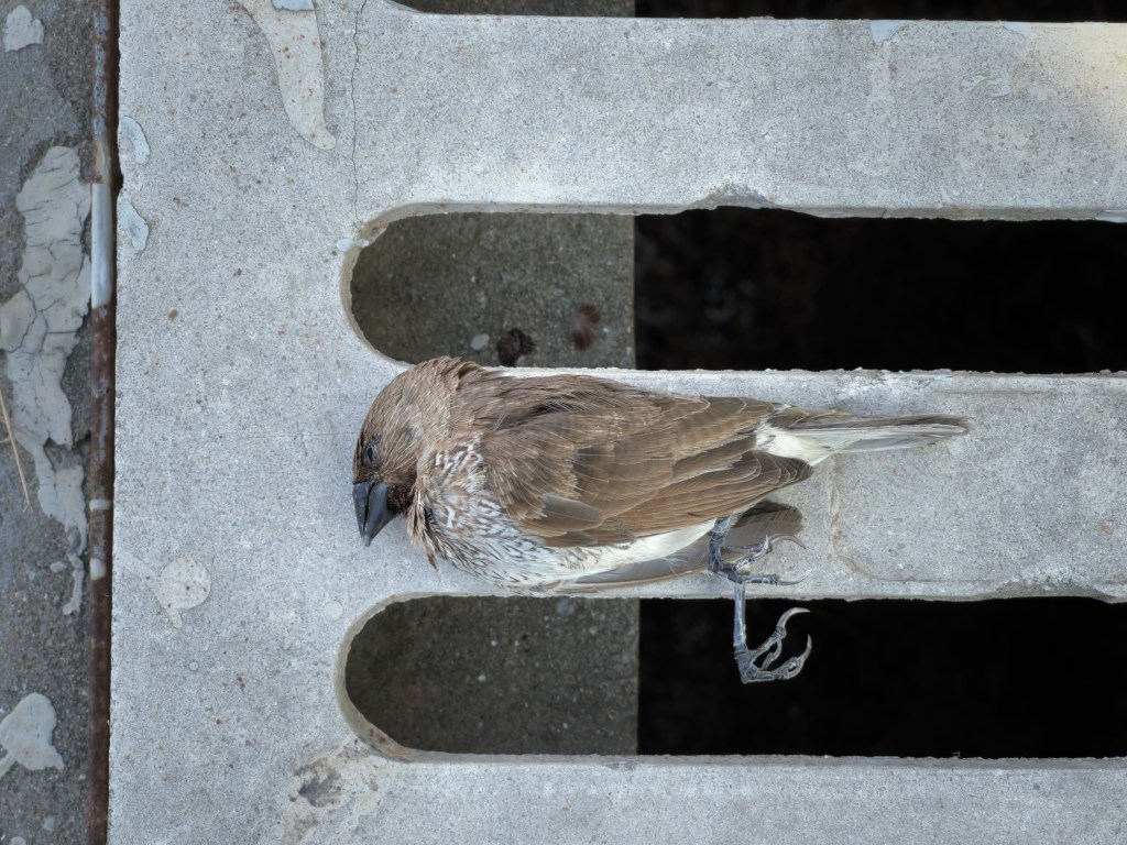 刚才上楼顶休息的时候,瞥见下水道面盖开孔处一截露出的羽毛。走近看,原来是一只已经死去的小鸟。