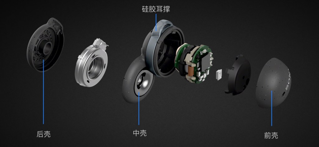 耳机本体的外壳一共只有 3+1 个零件:前中后三个塑料壳体,以及一个可换尺寸的硅胶耳撑。其中,开满孔阵的后壳和双环形态的中壳,充分体现了”一体化”的设计理念。
