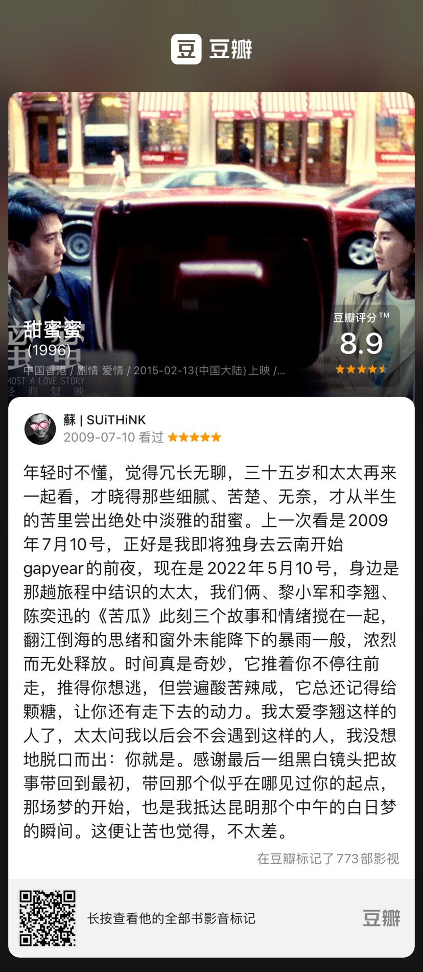 上一次看是 2009 年 7 月 10 号,正好是我即将独身去云南开始 GapYear 的前夜,现在是 2022 年 5 月 10 号,身边是那趟旅程中结识的太太,我们俩、黎小军和李翘、陈奕迅的《苦瓜》、《暗恋桃花源》此刻四个故事和情绪搅在一起,翻江倒海的思绪和窗外未能降下的暴雨一般,浓烈而无处释放。
