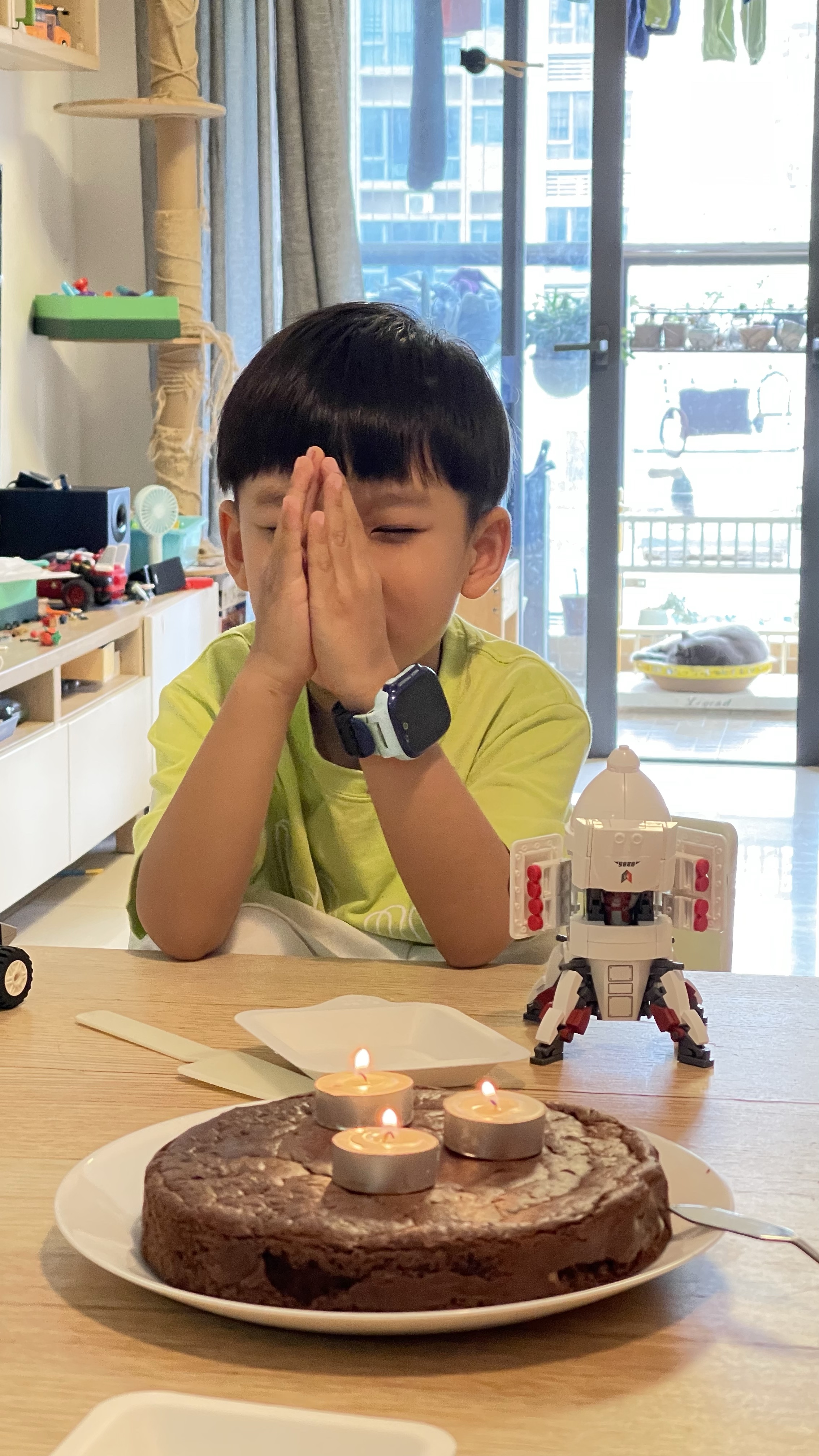 因为他提前一周从外婆那里要到念了一周的生日礼物,也就是右边的那个土星登陆舱,所以我们说你今年不会再有其他生日礼物了。并且由于这件事,我们不会叫小朋友们来办派对,因为叫来的话他们又会给你带来各种玩具,太过于容易得到,你又会不珍惜。