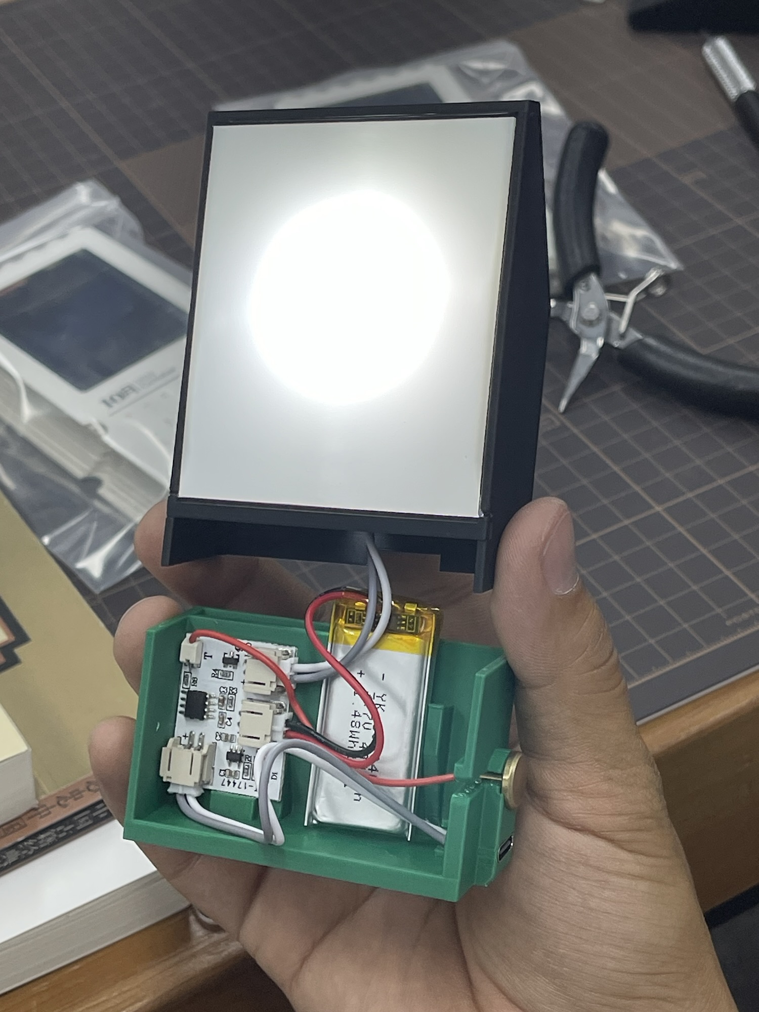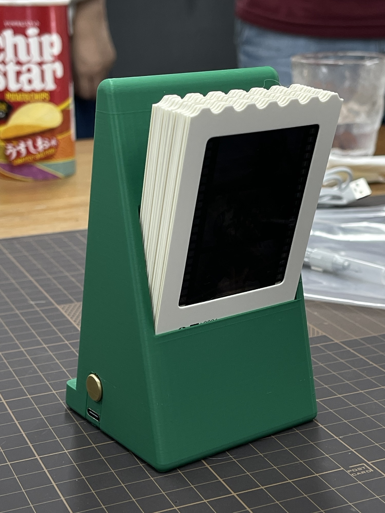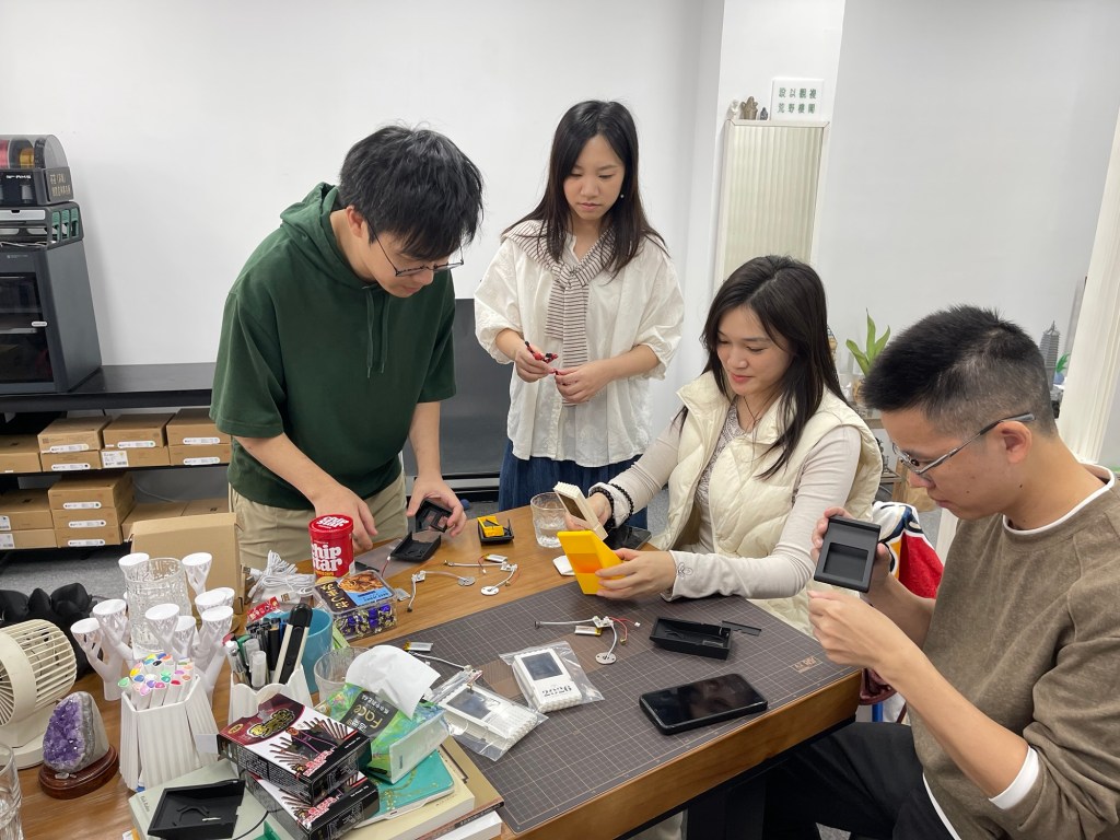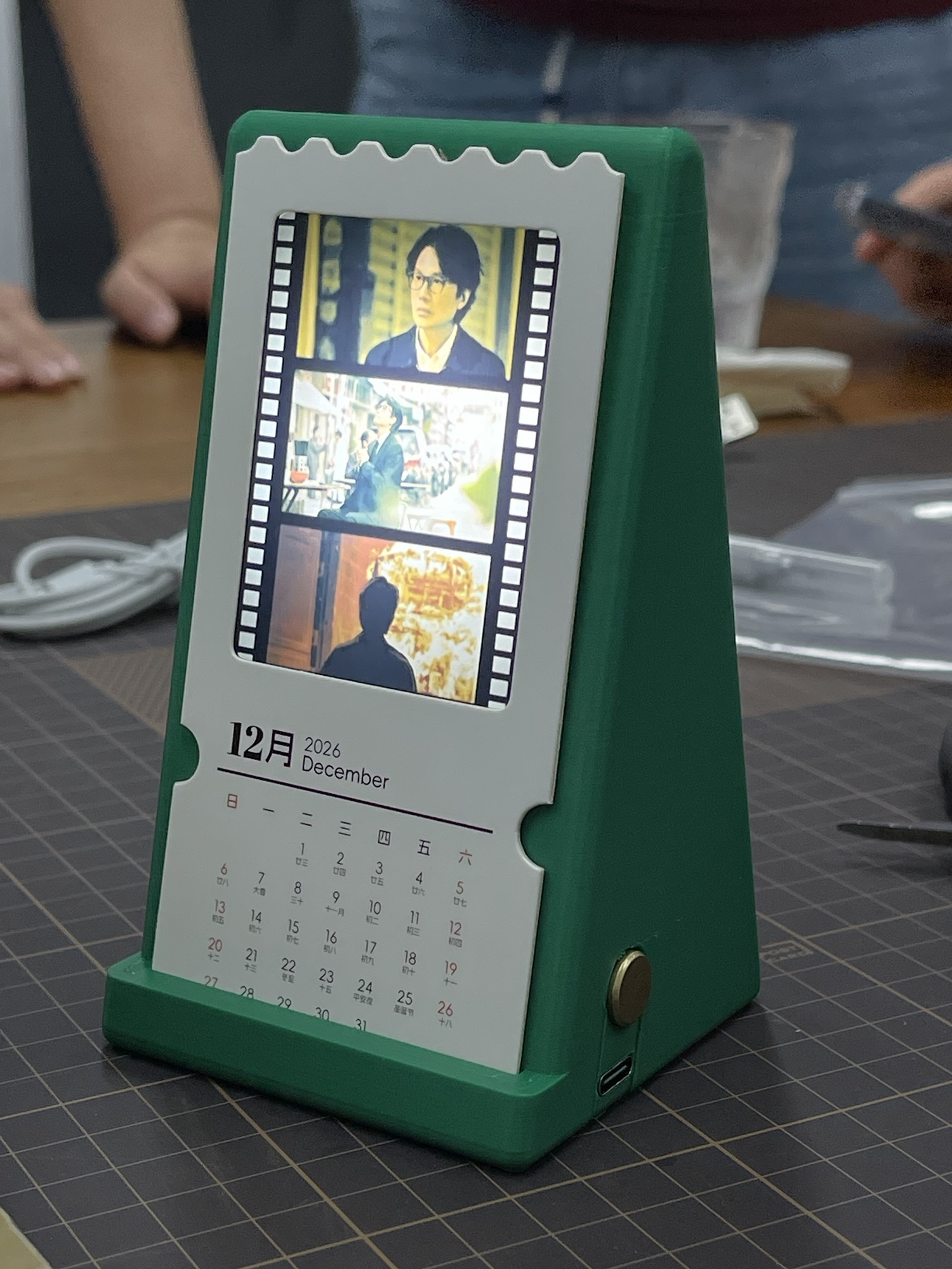 做完游戏,大家就一起拼装 PP 设计的电影日历。日历有背光和触控开关,都是他自己在淘宝上找的供应商,正面放了 12 部电影的胶片,底下日历部份还有 NFC 感应模块,触碰就会在手机上播放电影的主题曲。相当花心思的小产品!
