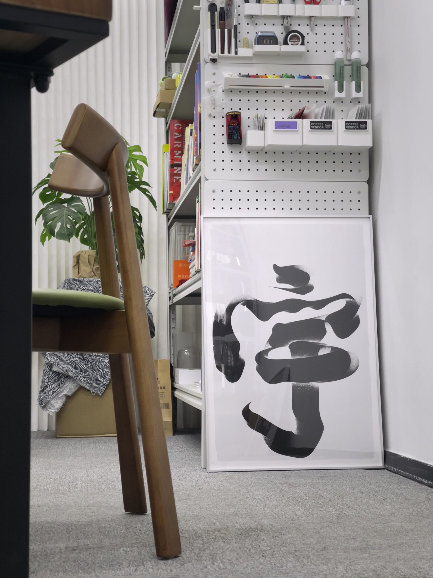 我这个小空间里没什么艺术气息,更多是个工具间和库房,因此疏于妆扮。但 More 这四张海报一进场,配合纤细冷峻的铝制画框,小破屋竟有那么几分像是个艺术画廊。